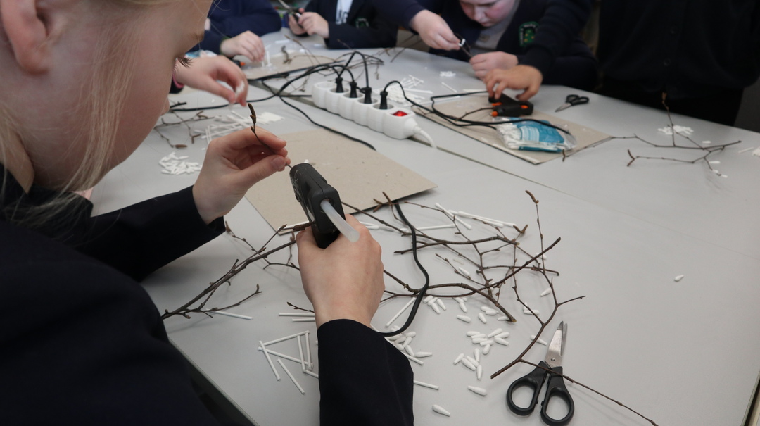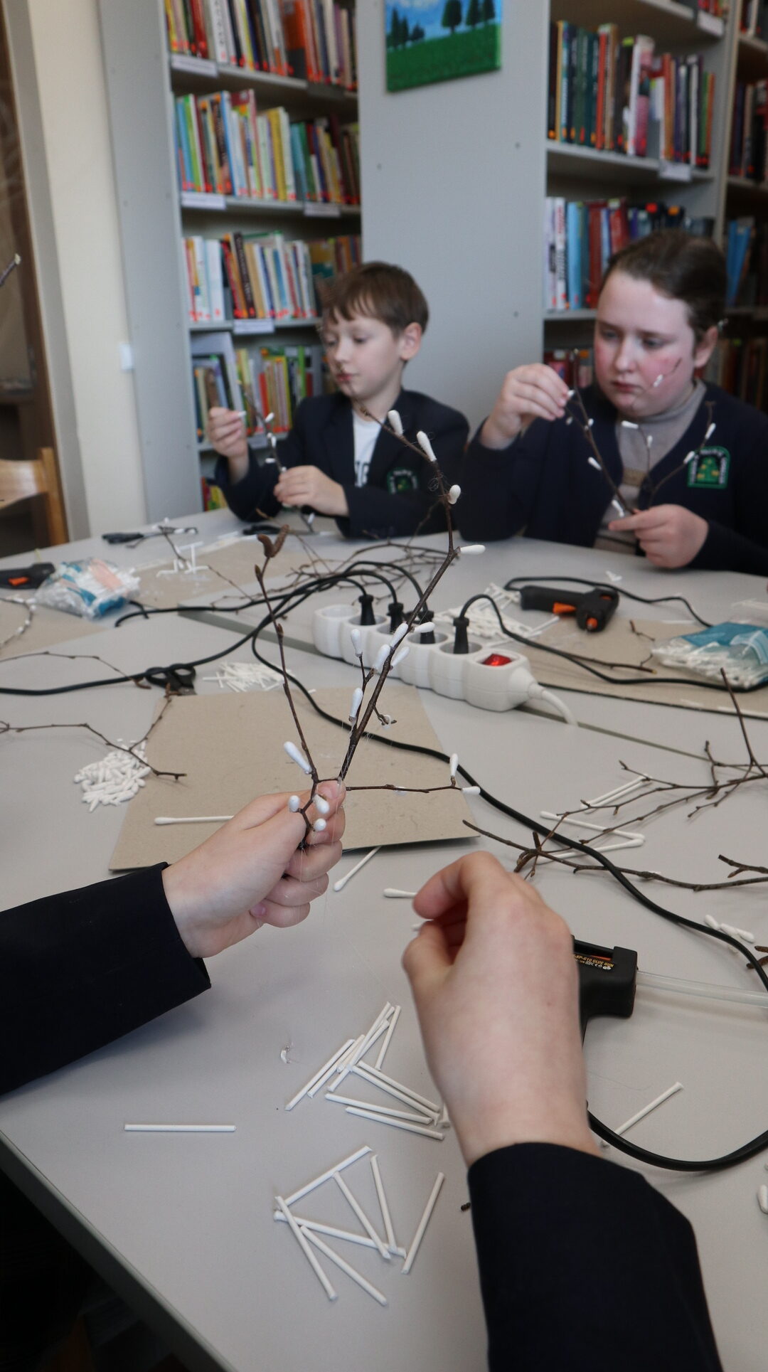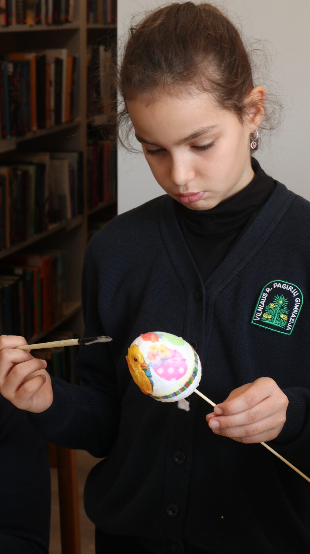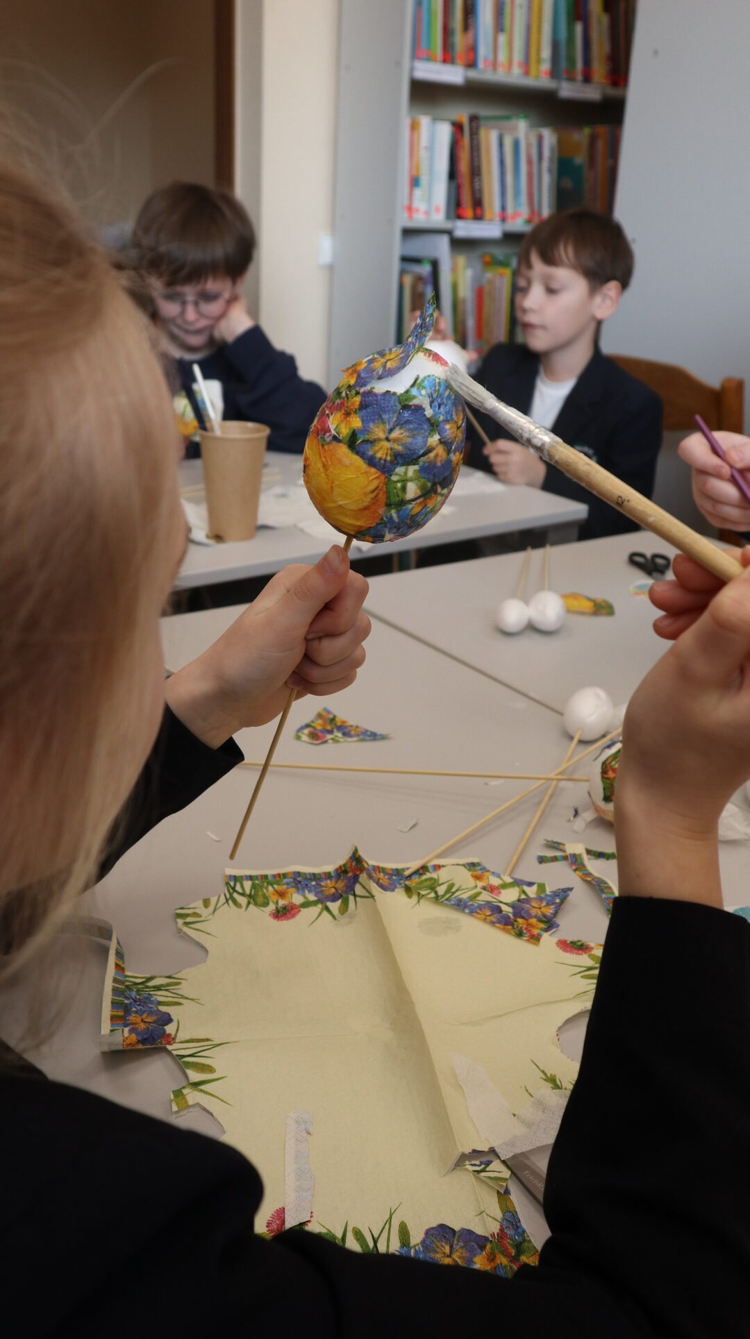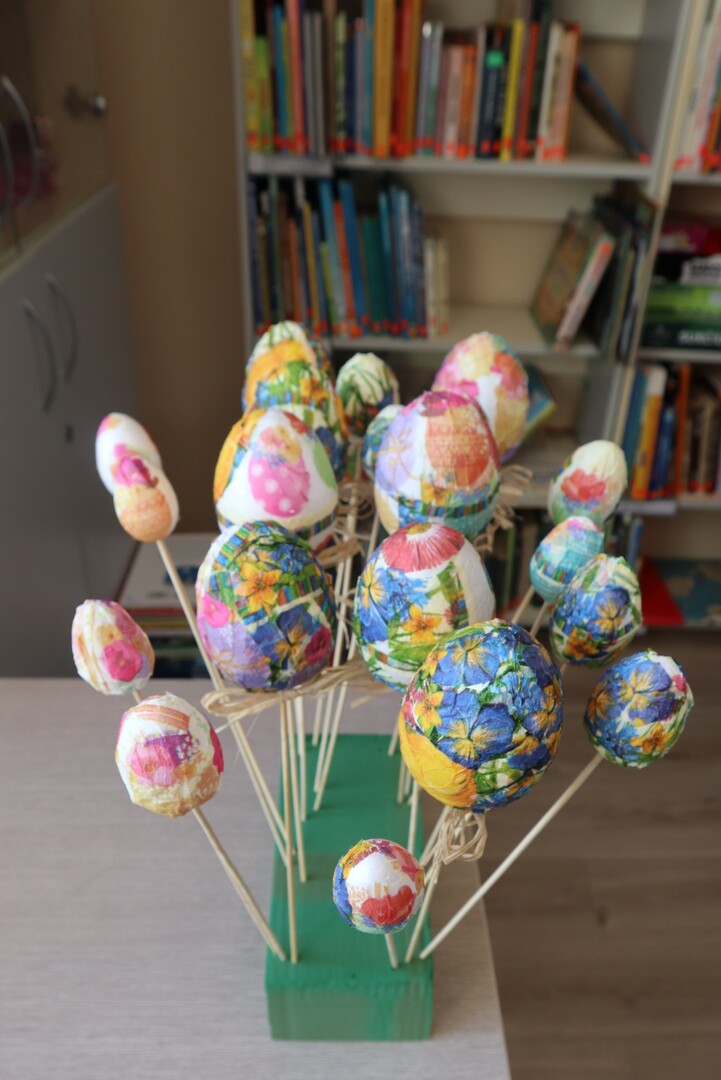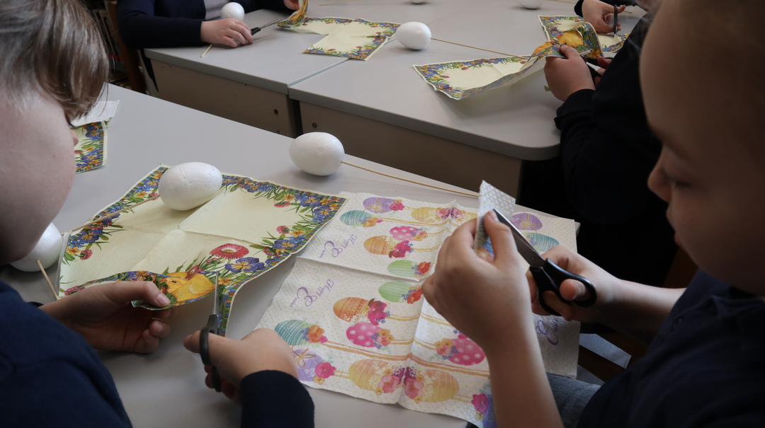 Vėliau visi kibo į kūrybinį darbą – dekoravo putplasčio kiaušinius servetėlių iškarpomis, gamino verbas iš šakelių ir ausų krapštukų bei kūrė gražias Velykines kompozicijas. Darbo metu netrūko geros nuotaikos, kūrybiškumo ir juoko.